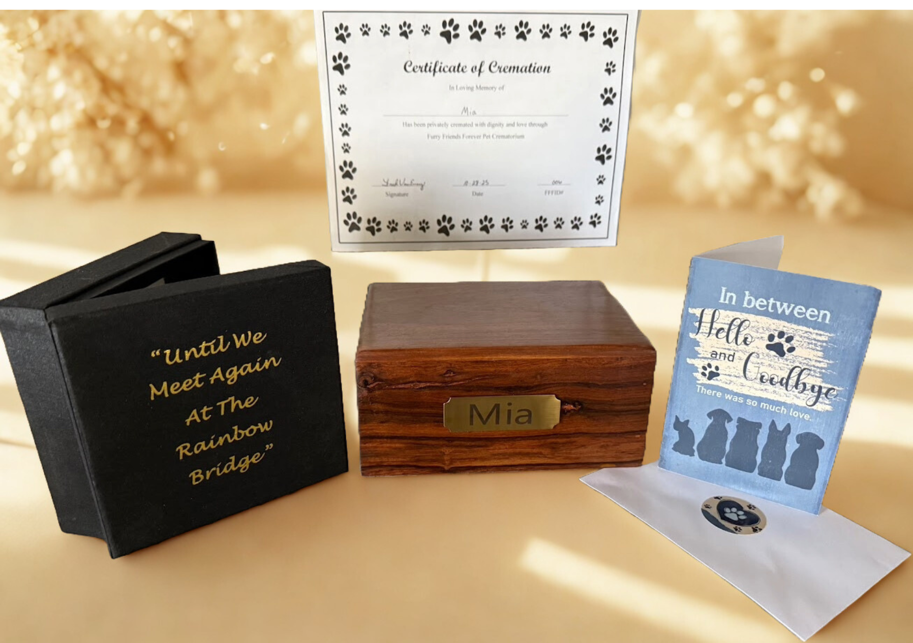 Private Cremation: Pet cremated individually and pet ashes returned in wood urn with engraved name plate. Cremation Certificate and Card. See Image above- not Included Paw Print- Black Rainbow Bridge box additional $25.